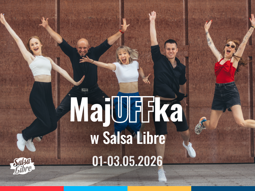 Spędź MajUFFkę tanecznie w Salsa Libre! Sprawdź grafik MajUFFka w Salsa Libre to intensywne zajęcia taneczne podczas długiego weekendu – 01.05-03.05. Tańczymy codziennie od piątku do niedzieli! Przyjdź i spędź
